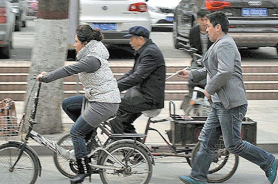 Snaps show him sneaking up on his unsuspecting victim while she pedals along, reaching into her coat with chopsticks before plucking out the phone.